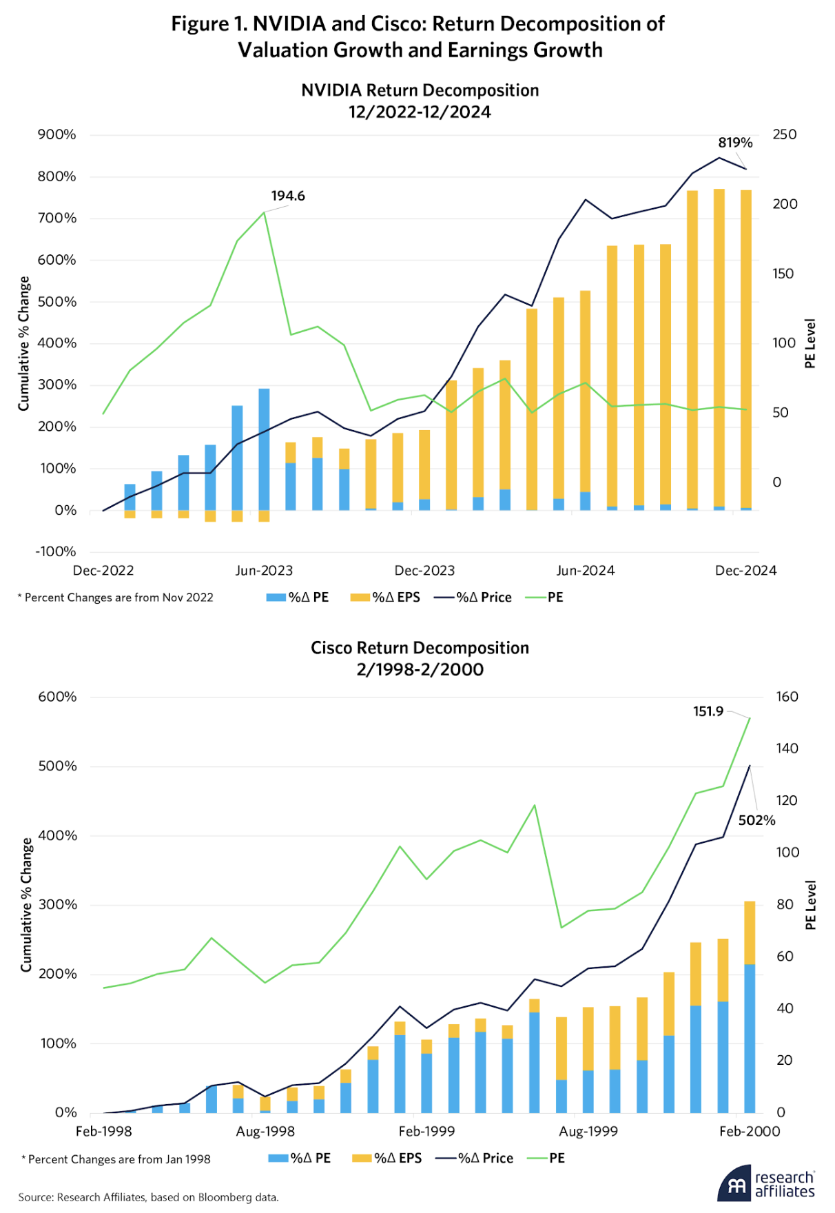 Kuvaajat havainnollistavat mainitun eron nykyisen AI-buumin ja vuosituhannen vaihteen IT-kuplan välillä vertaamalla Nvidian (2022–2024) ja Ciscon (1998–2000) kurssikehityksen taustatekijöitä.
